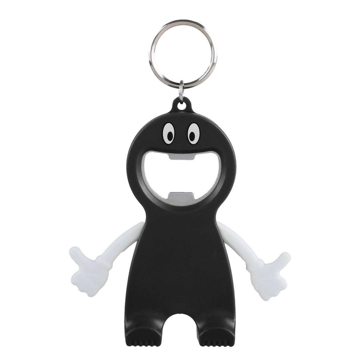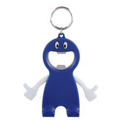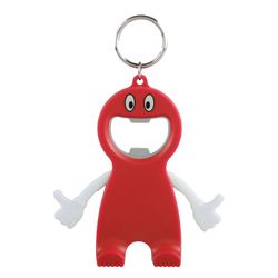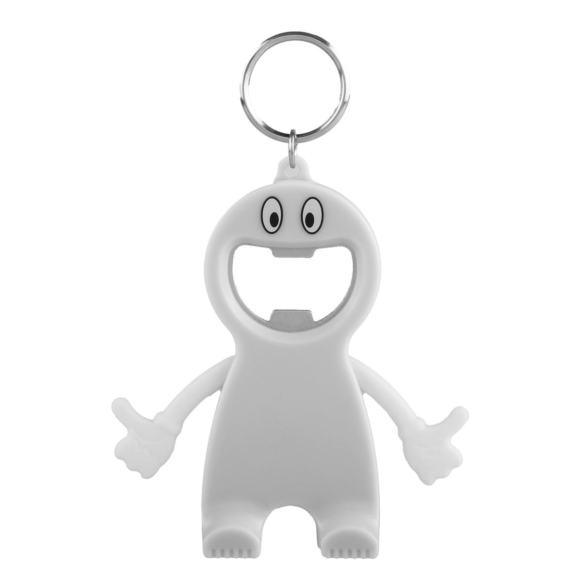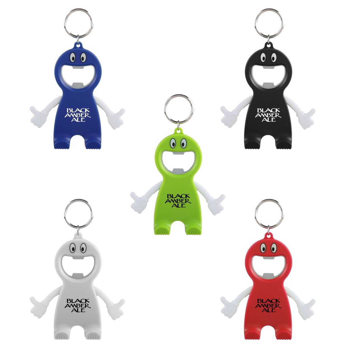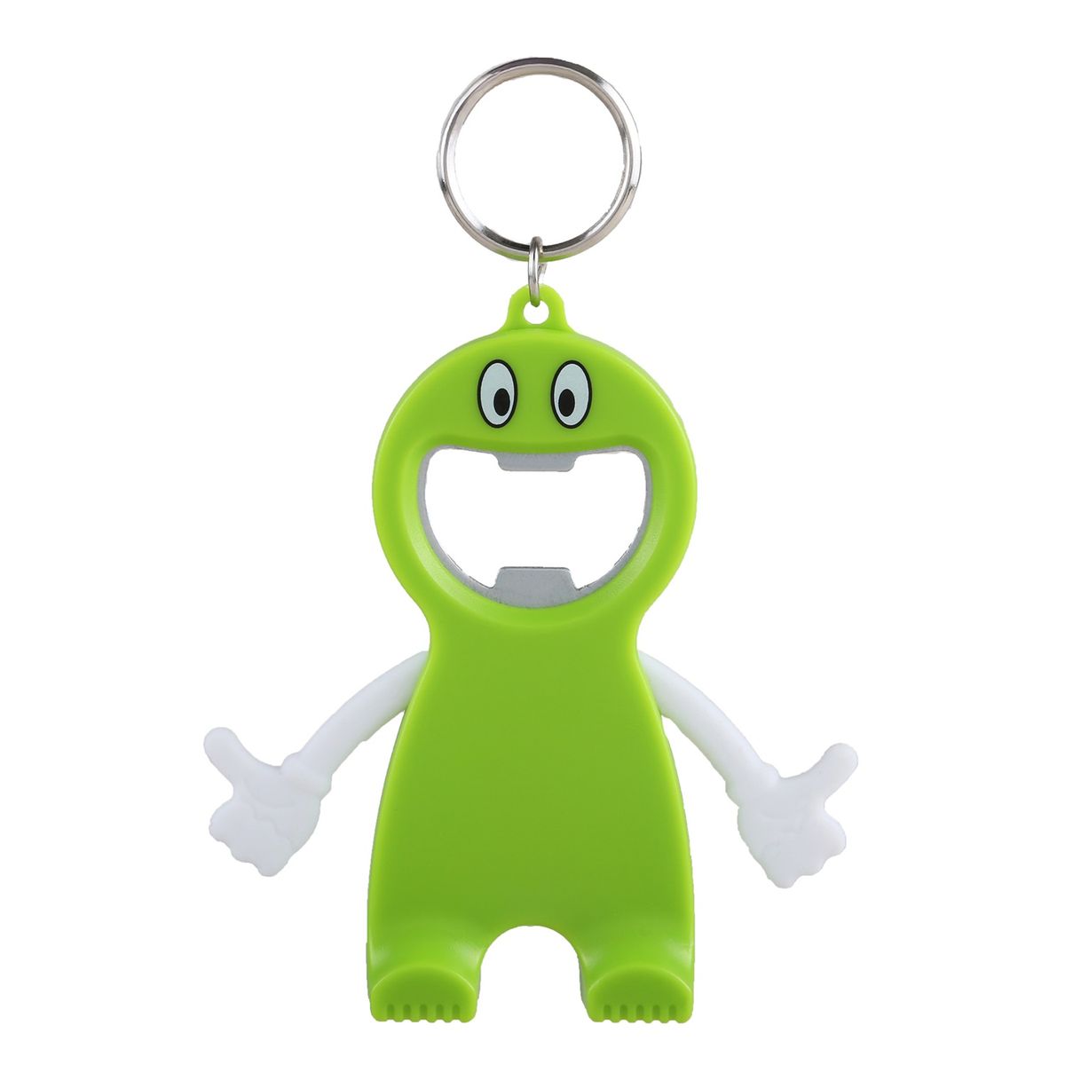 Add a touch of fun to your marketing campaign with this cheerful character bottle opener. Crafted from sturdy ABS, stainless steel, and silicone, it features a playful design with arms and legs where the mouth acts as the heavy-duty opener. Perfect for parties and everyday use, this keychain ensures you never lose your opener again. Customize it by imprinting your company logo on the body to create a memorable promotional giveaway that brings a smile to your clients' faces. Available in the USA.