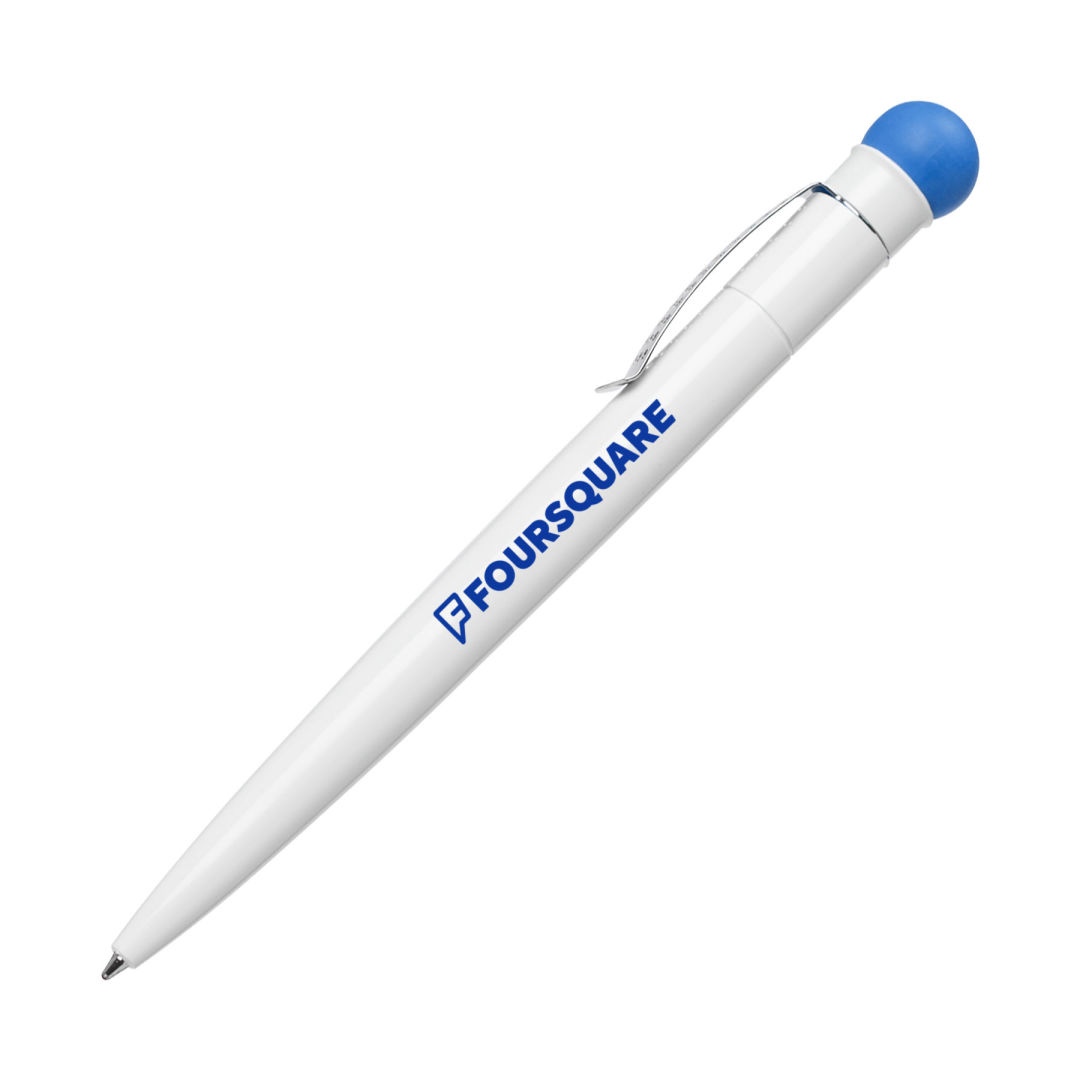 Unique design. This German made ballpoint pen has a flexible rubber ball pusher and a sturdy steel clip accented with perforated holed. The barrel has a large, continuous advertising space.
