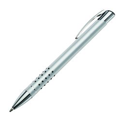 Aluminum click action ballpoint pen with rubber grip and chrome trim.