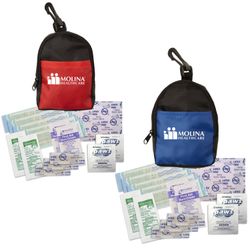 This mini backpack emergency first aid kit is made of durable 420D polyester. The pouch mimics a backpack shape and includes a carabiner clip for attaching to backpacks, purses, or laptop cases. Perfect for schools, colleges, companies, and sports promotions, it can feature an imprinted logo. The 15-piece kit includes 5 latex-free bandages, 3 snip bandages, 2 Paws towelettes, 2 hand sanitizer packets, 2 first aid cream packets, and a 2" x 3" adhesive pad. Available in the USA.