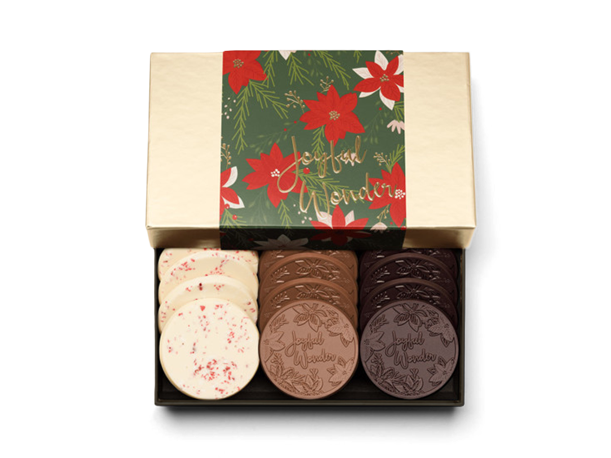 Indulge in winter's wonder with this 12-piece gourmet cookie gift set. Each sugar cookie is individually wrapped and topped in rich premium chocolate. Includes four milk chocolate, four dark chocolate, and four peppermint bark cookies. The milk and dark varieties showcase an classic poinsettia design, and the collection comes beautifully packaged in a luxury gift box. A perfect treat for clients, colleagues, friends or family this holiday season.