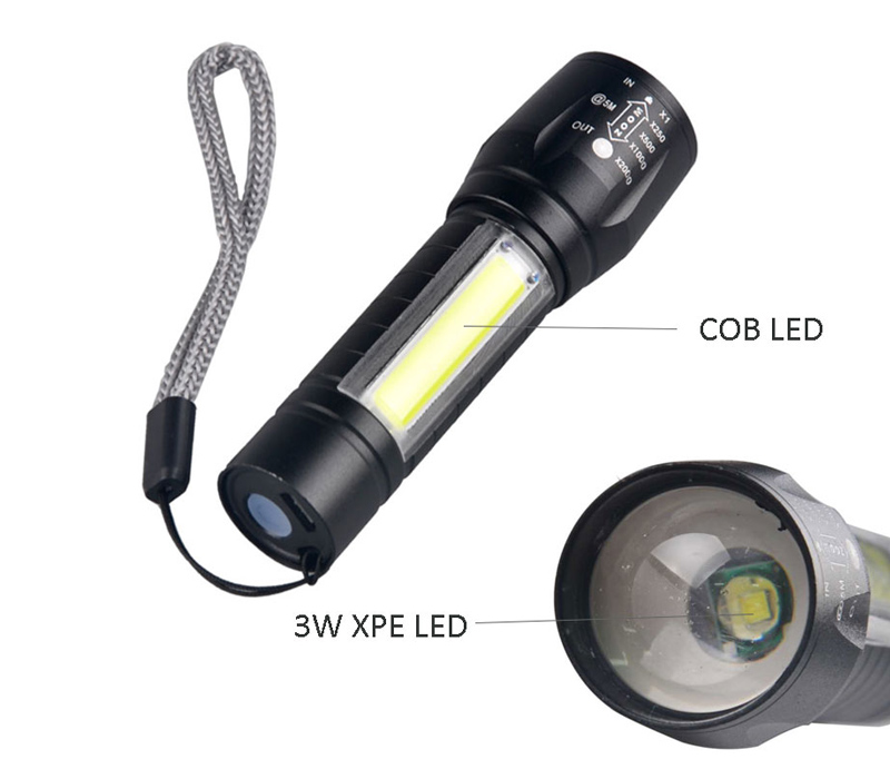 Modes: 3 mode switch: CREE LED high, CREE LED strobe, COB LED ON