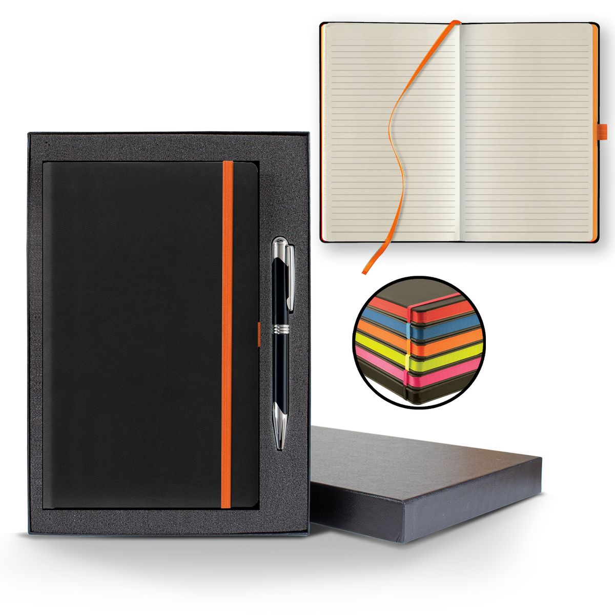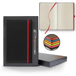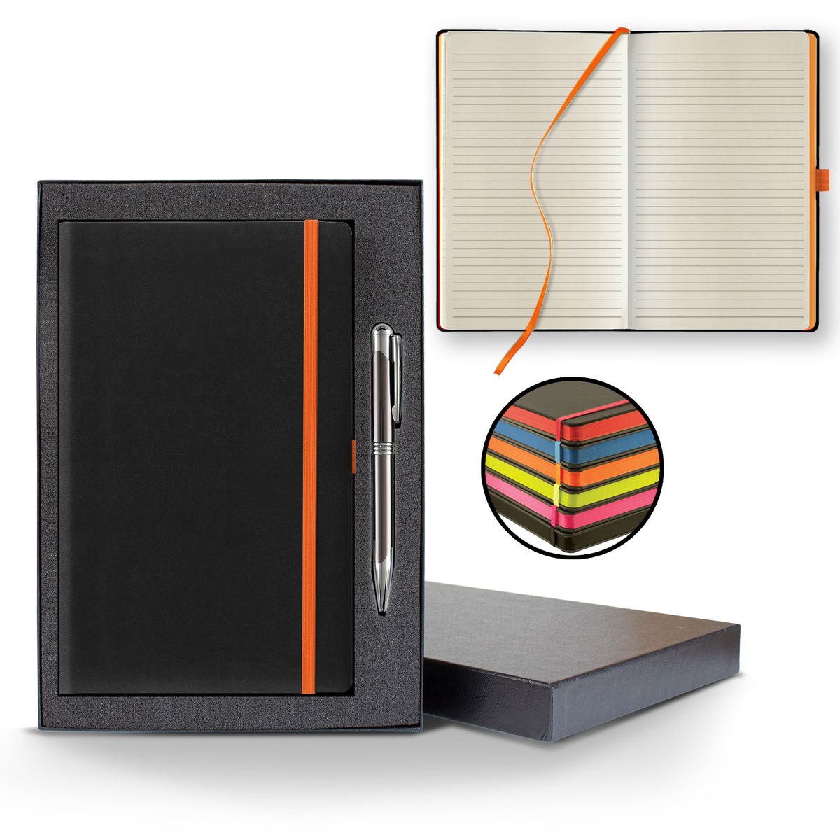 Customers will write down great reviews about your company when you distribute these journals! Measuring 5 1/4" x 8 3/8, the Tucson Edge Medium Ivory Journal comes in a sleek black gift box with either black or gunmetal pens! Red, White, & Blue pens also available upon request. Also included are a pen loop, elastic closure and lined pages in gray print on 224 pages of FSC® certified ivory paper. It's also equipped with a back paper pocket and a gold ribbon marker. It's a great choice for seminars, business meetings, tradeshow giveaways and much more. Get extra brand exposure by taking advantage of our imprint options! FSC MIX 70% CQ-COC-000479